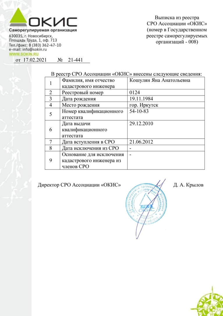 | Кошулян Яна Анатольевна | Кадастровый инженер |